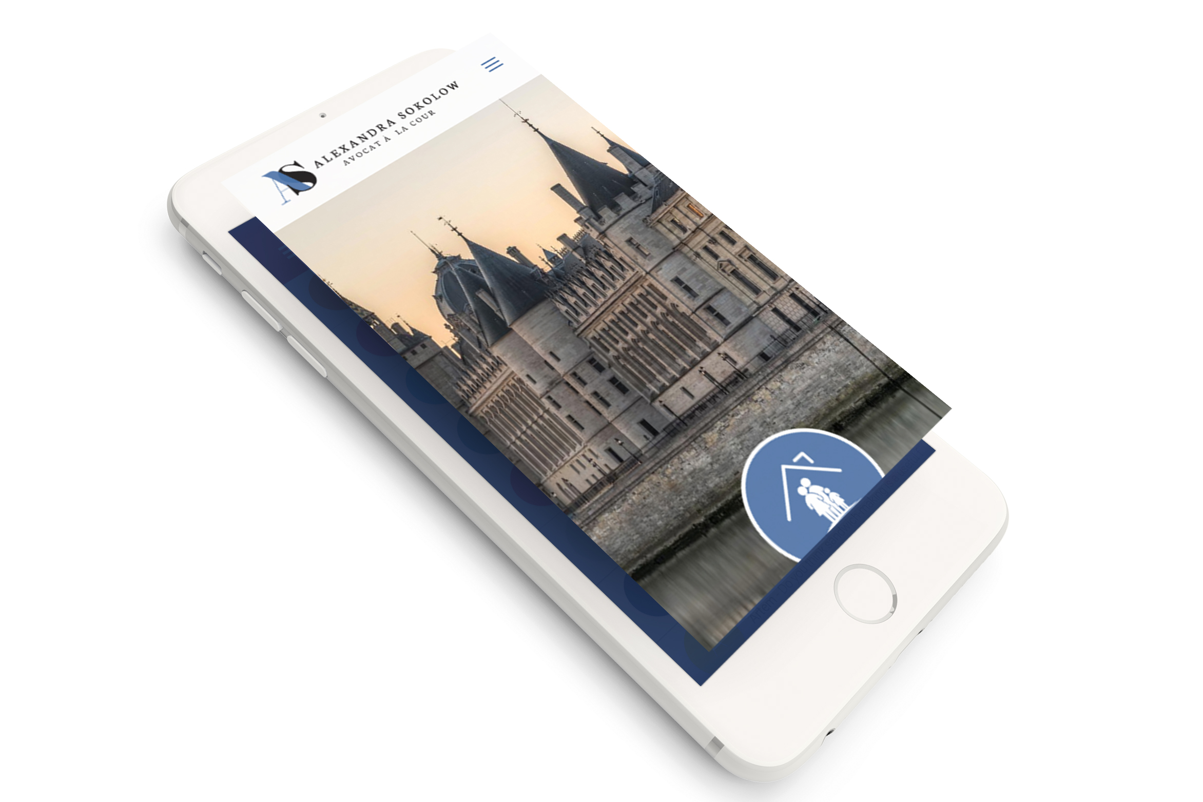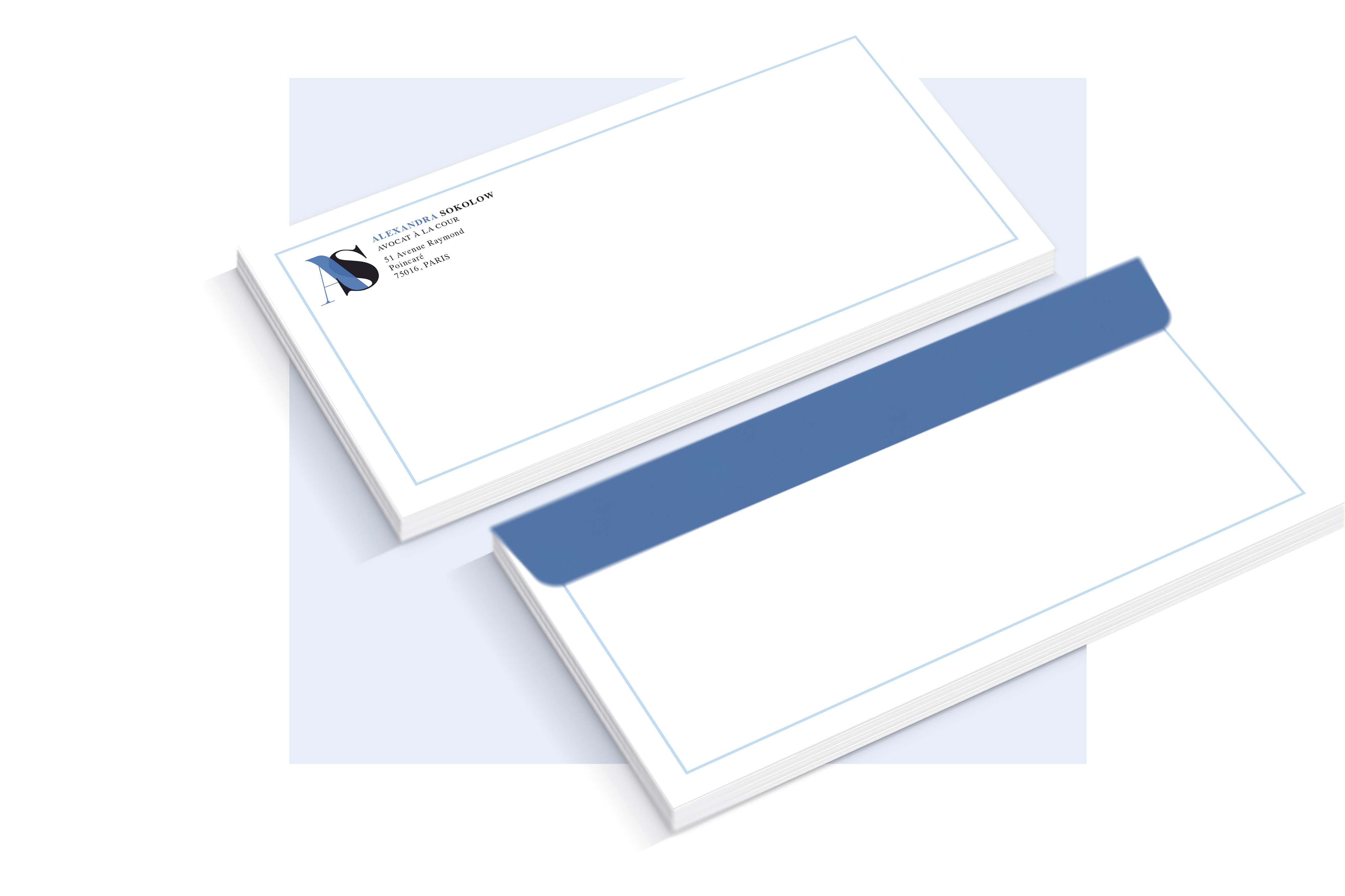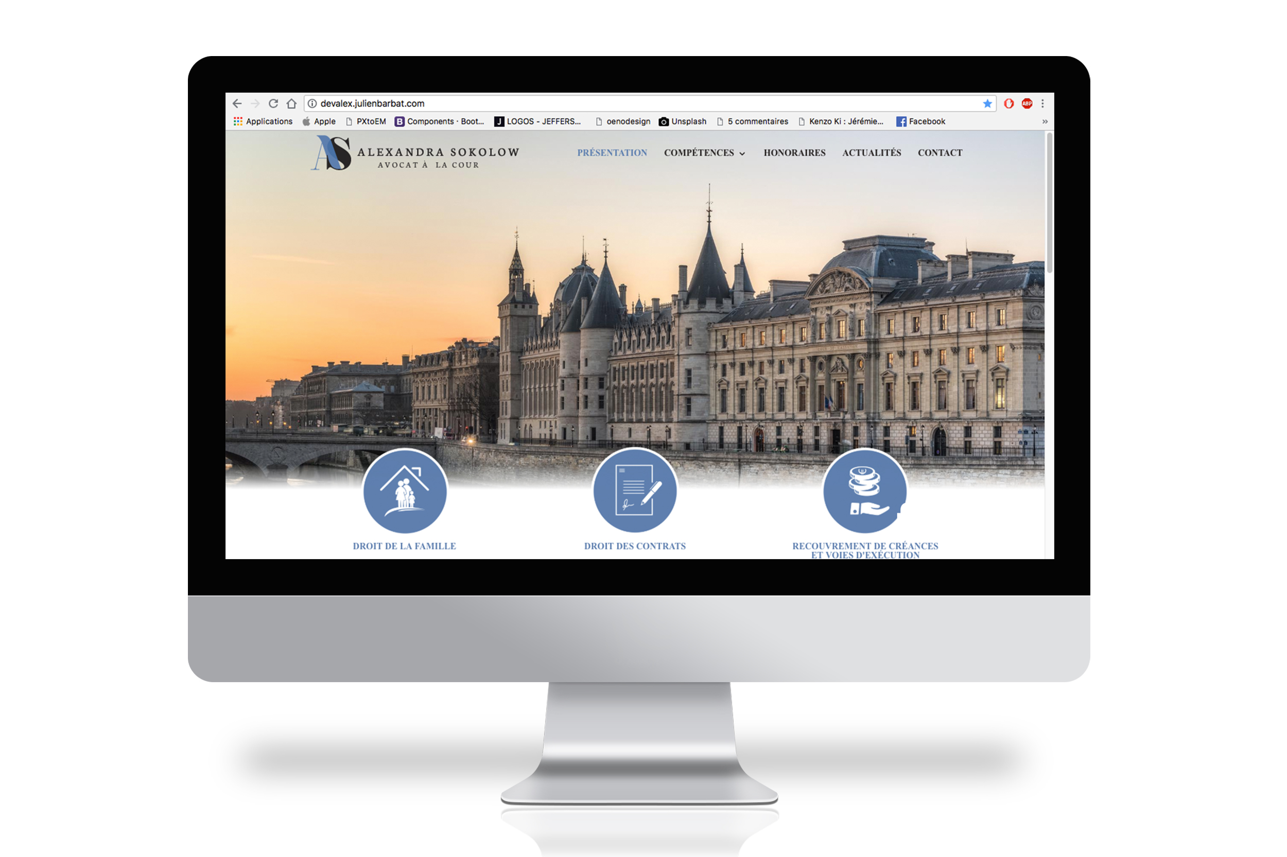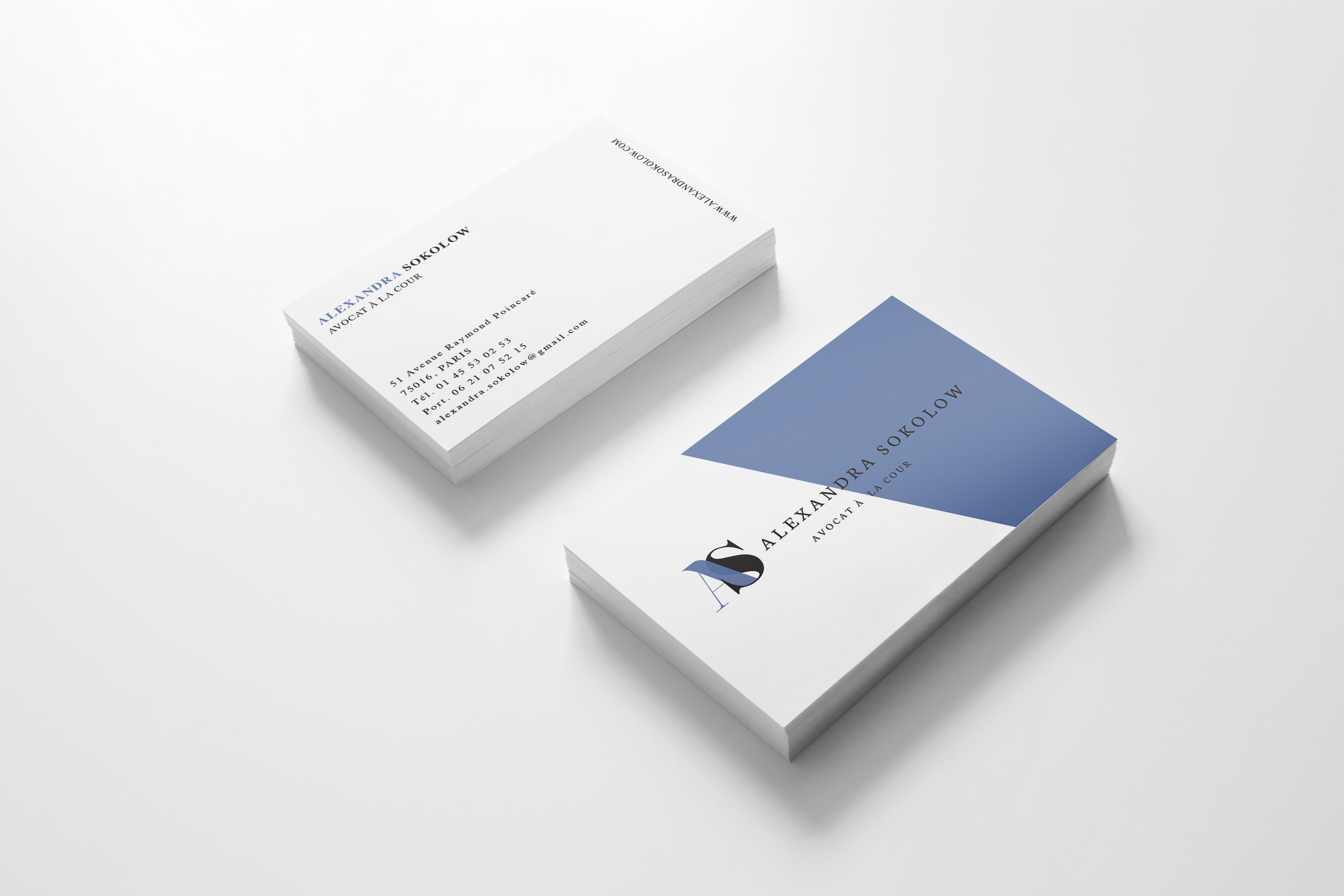 Réalisation de l'identité visuelle de Maître Sokolov, Avocat à la cour. Conception de la charte graphique, réalisation des éléments visuels graphiques pour le site vitrine à l'intégration.
